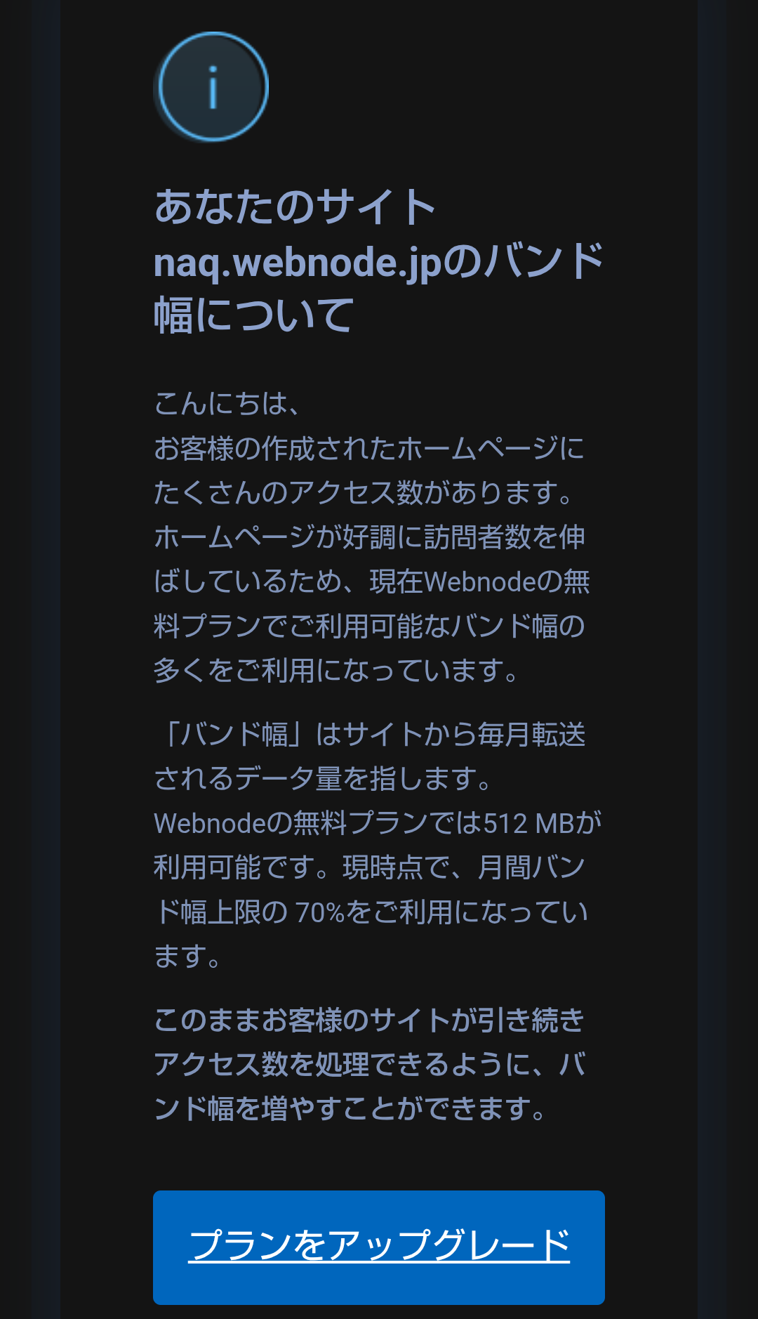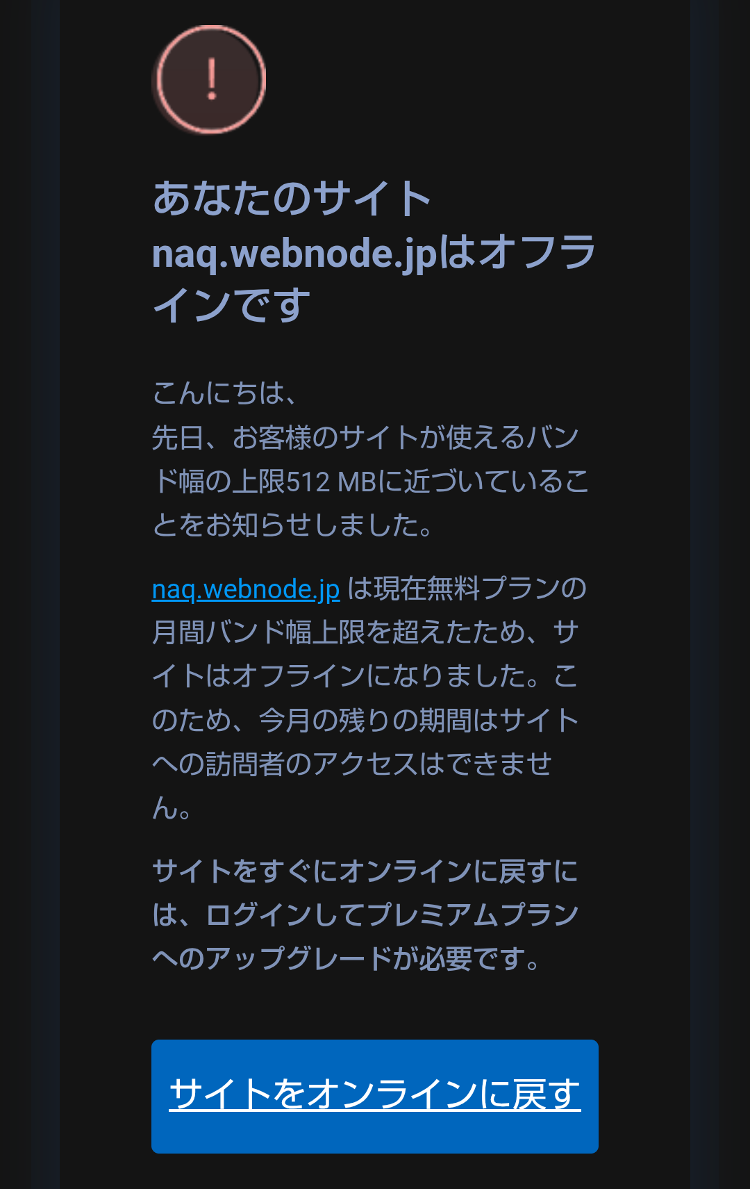 前回超えたのは2022/9末だったんだけど、その時はこんなメール来なかったし、サイトも落ちたりしてない。お前仕様変わったんか? webnode。それならそうと言ってくれよ。