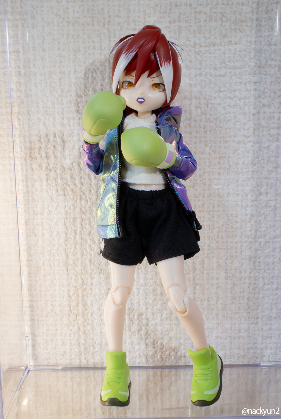 ねんどろ類似形状の顔(意匠登録してないので、互換商品は作ってもOKっぽい)に髪パーツをドッキングさせる形式がもはや海外ドールでは標準規格にになってて、御多分に漏れずコレもそうなんだけど、試しにねんどろ髪を付けると重すぎてバランスが取れなくて膝から崩れ落ちちゃう。球体関節ドールって、このゴムのテンション調節がめんどくさいのよね。まあ、頻繁に手足肩がポロリするジョイントドールと天秤にかけたらこっちが勝つけど…(個人の感想です)。